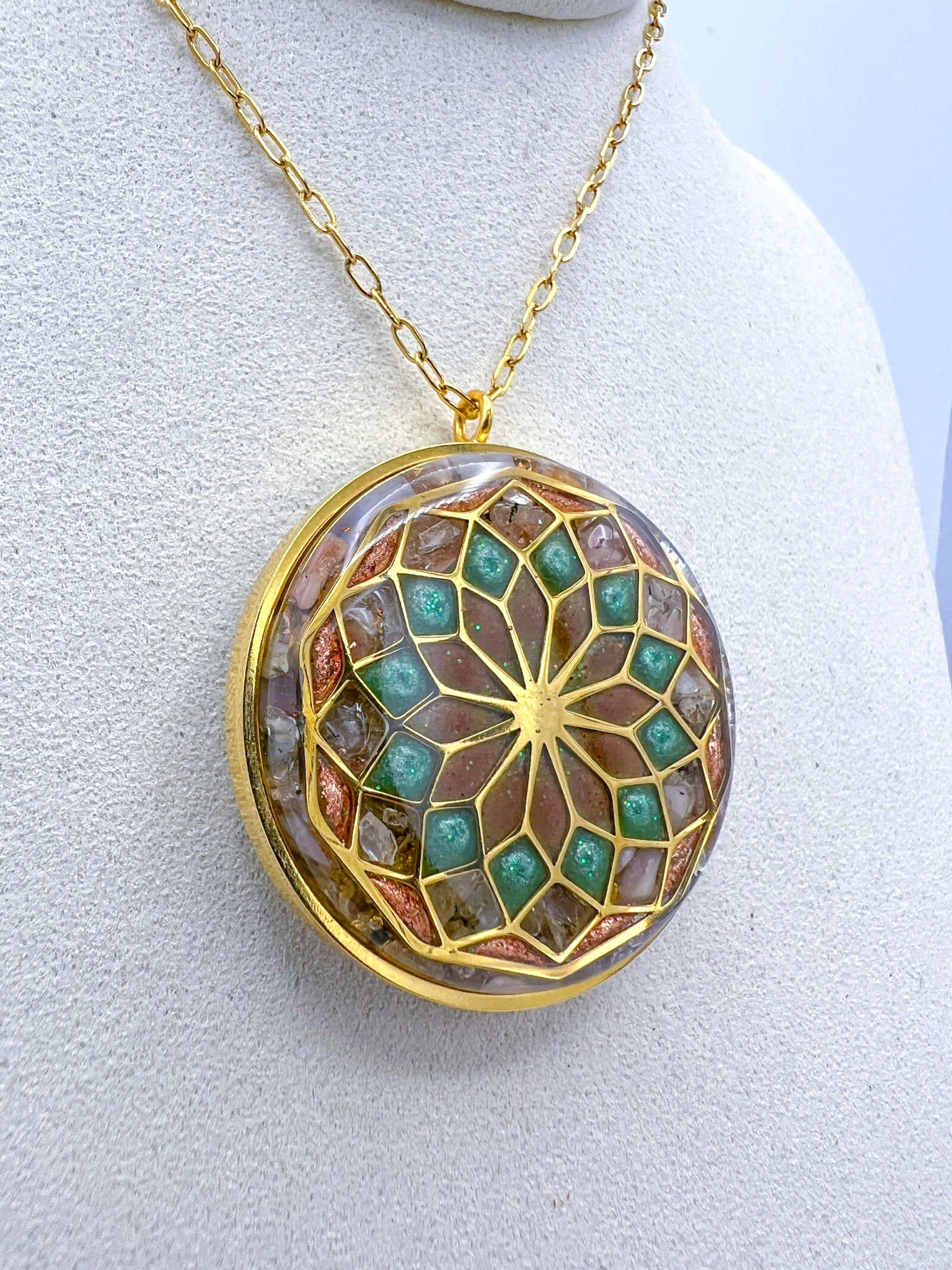Pendentif Orgonite - Lotus de vie, Pierre du soleil, tourmaline multicolore.